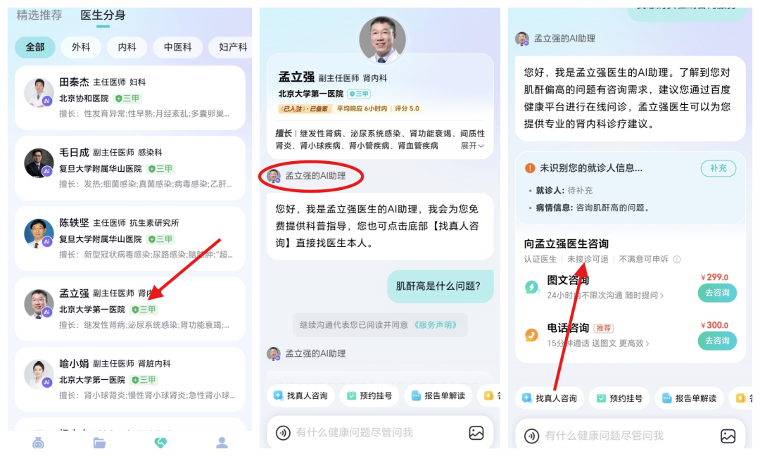 目前,百度健康AI管家已吸引超1万名三甲医院医生开通助理,比如北京协和医院妇科主任医师田秦杰的分身、复旦大学附属华山医院感染科毛日成副主任医师的分身……
