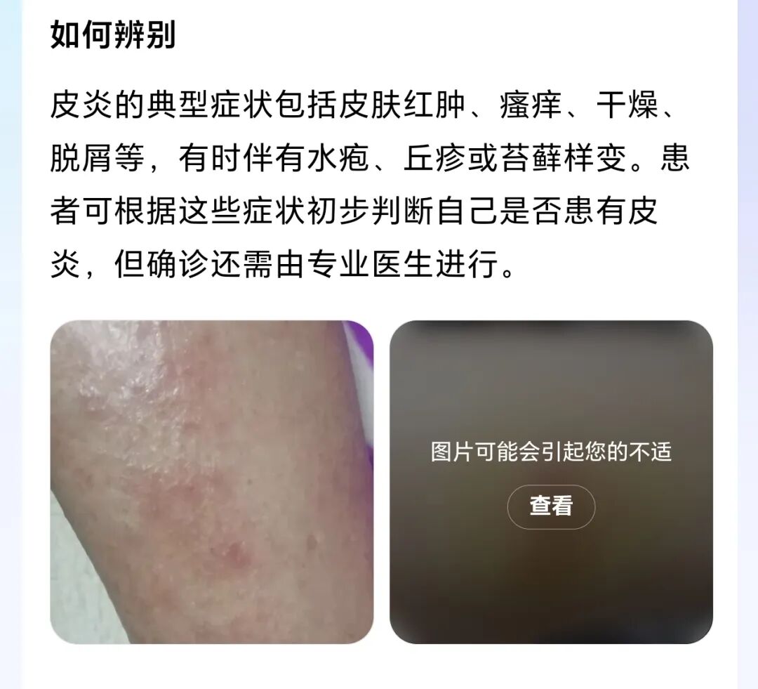 像在咨询皮肤问题时,它会先解读症状,再列出几种可能的皮肤病,并提供典型的病例图片供用户参考比对,帮助其更准确地理解自身状况。(还很贴心地给图片打码了)