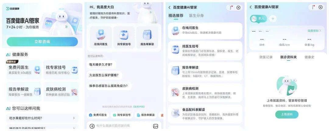 从用户打开百度健康AI管家进行健康咨询,到获得诊断建议、预约挂号,再到管理个人健康档案,每一个环节都有相应的AI应用提供支持。