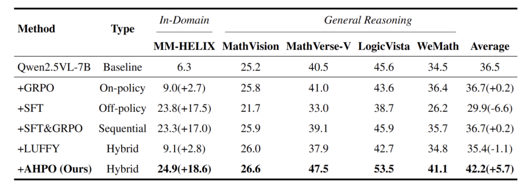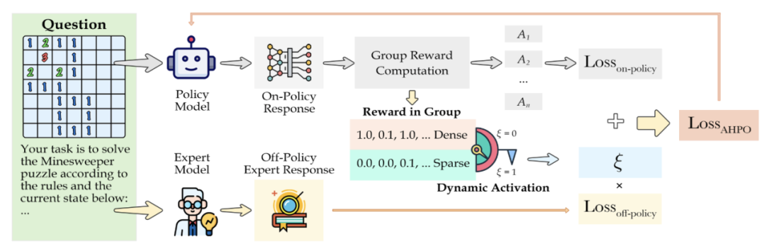 为此,团队提出了创新的自适应混合策略优化算法(Adaptive Hybrid Policy Optimization, AHPO)。