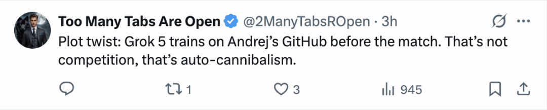 比如,Grok 5会跑到GitHub上拷贝卡帕西的代码然后打败他吗?
