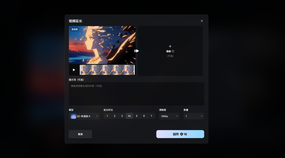 这个功能的按钮,就在生成好的视频下方,点击后就可以节选任意视频帧进行延长,或者我们也可以上传图片延长至尾帧。