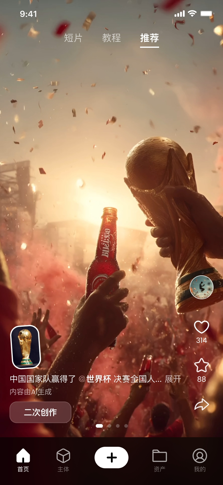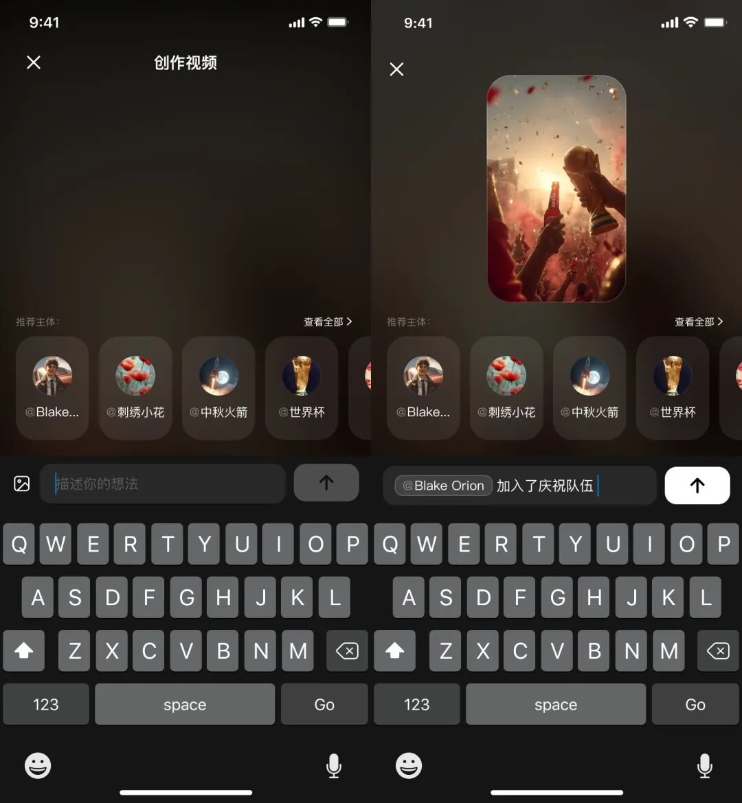 同时APP端内置海量主体库,包括人物、动物、特效等丰富素材,用户可以直接调用喜欢的主体,随时随地生成好玩有趣的视频。