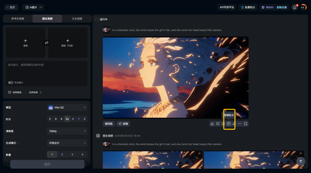 我们在生成好的视频处点击“视频延长”功能,继续创作: