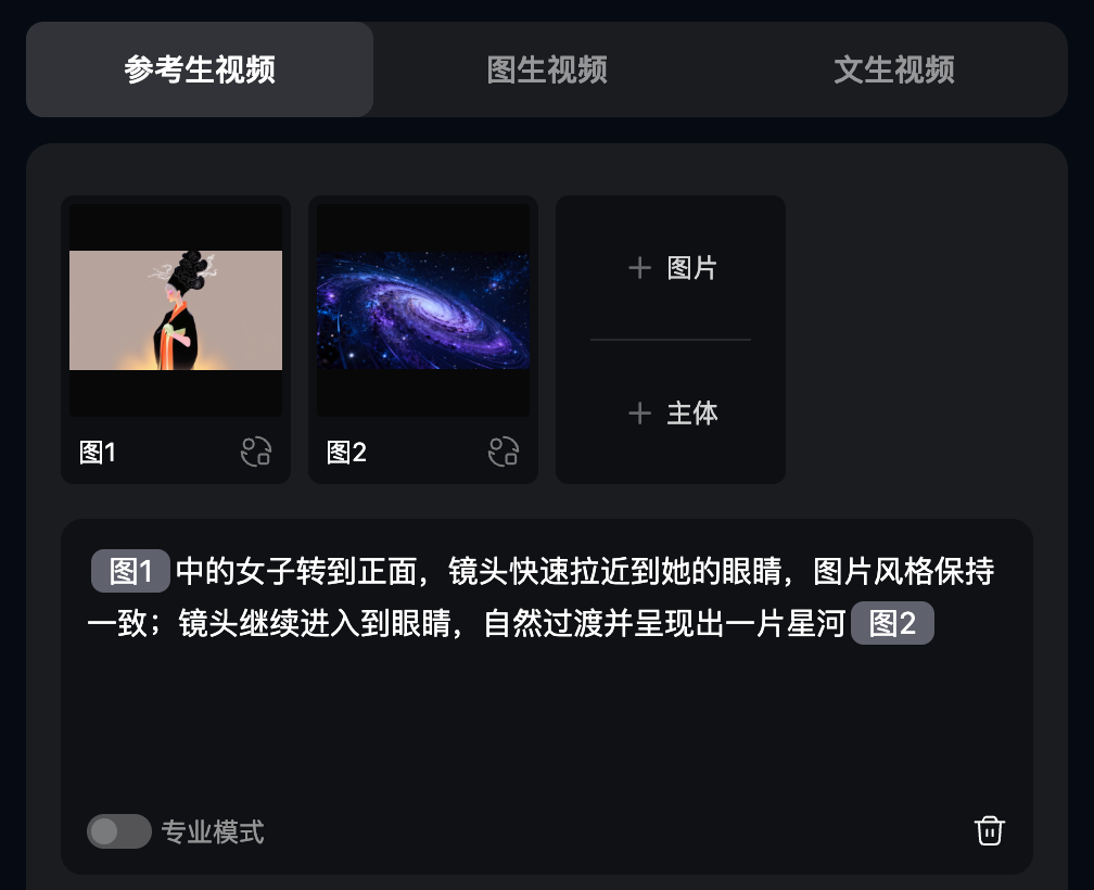 我们首先在参考生视频界面里上传两张图片,并附上一句Prompt: