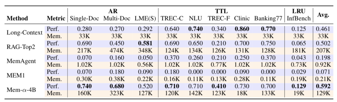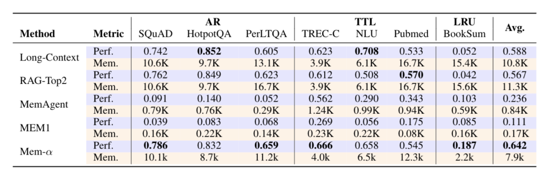 全面超越现有方法:在所有任务上显著优于基线。在MemoryAgentBench上,精确检索(AR)和长期理解(LRU)任务尤其突出,证明了对未见分布的强泛化能力。