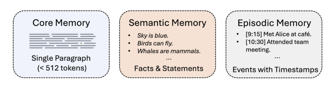 为了展示Mem-α框架的有效性,研究团队设计了一个包含三种记忆类型的复杂记忆系统,灵感来源于认知科学中的记忆分类理论: