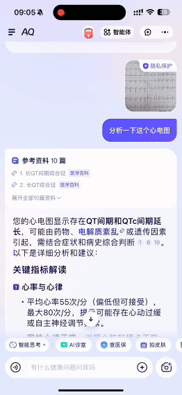 我又丢了份心电图上去,它也能看得门儿清,连心率异常和QT间期延长都能识别出来: