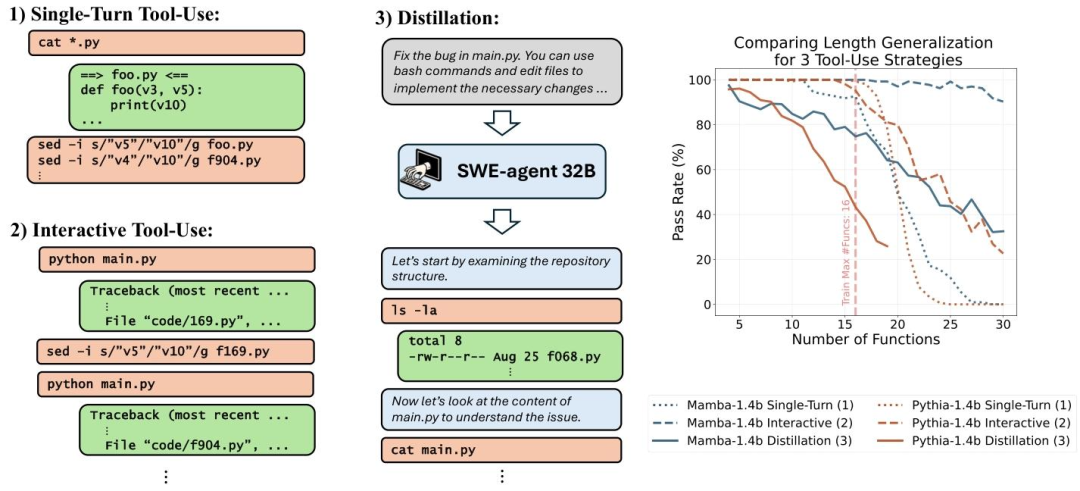 在代码调试任务中,让Mamba模拟交互式调试流程(查看文件、局部修改、执行验证的迭代方式),面对复杂度高于训练集的代码库,其正确率显著高于Transformer;