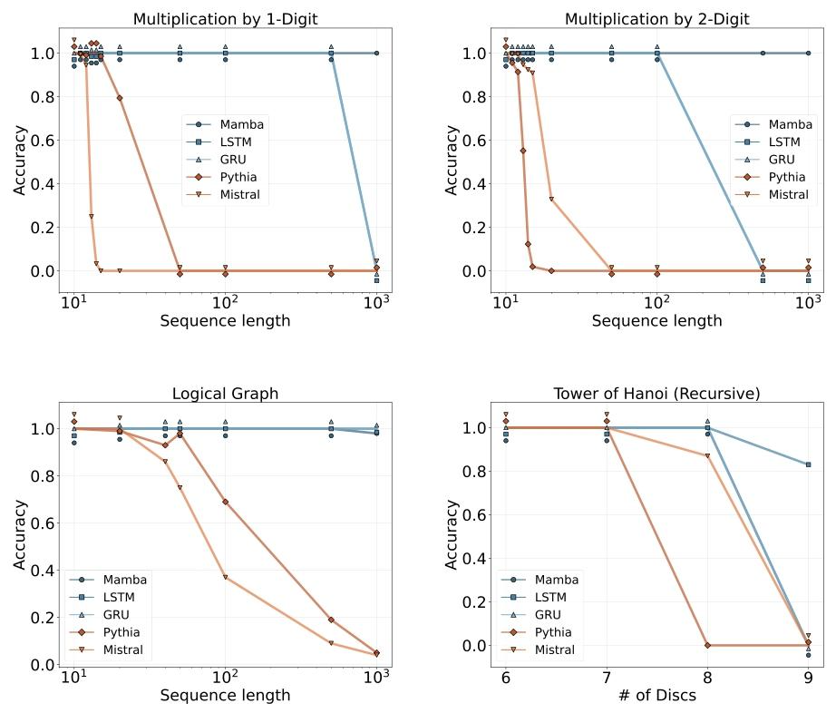 在逻辑推理及汉诺塔等需要分步规划的任务中,结合工具的Mamba能够应对更复杂的问题场景,Transformer则要么算得慢,要么直接卡壳……
