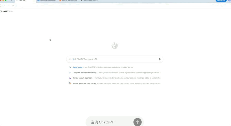 第五则是Agent模式。该模式结合你的浏览上下文,速度更快、实用性更强,能更好地进行研究与分析、自动化任务,以及在你浏览时规划行程或预订预约。