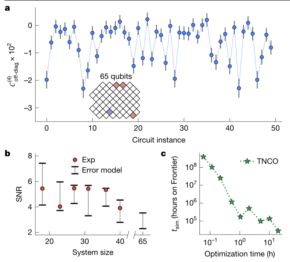 这种“大循环干涉”让经典计算机很难模拟。他们用最强超级计算机Frontier尝试模拟 65 个量子比特的 OTOC⁽²⁾信号,需要约 3.2 年;而量子处理器测一次只需要 2.1 小时,速度差了1.3万倍。