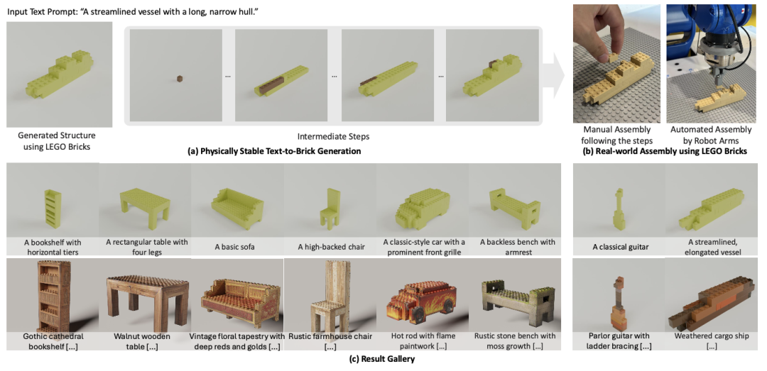 研究团队构建了一个大规模、物理稳定的积木结构数据集StableText2Brick,包含超过47000个积木结构,涵盖28000多个独特三维物体,每个结构均配有详细的文字描述,并训练了一个自回归大型语言模型,通过逐步预测“下一个积木”来生成完整结构。