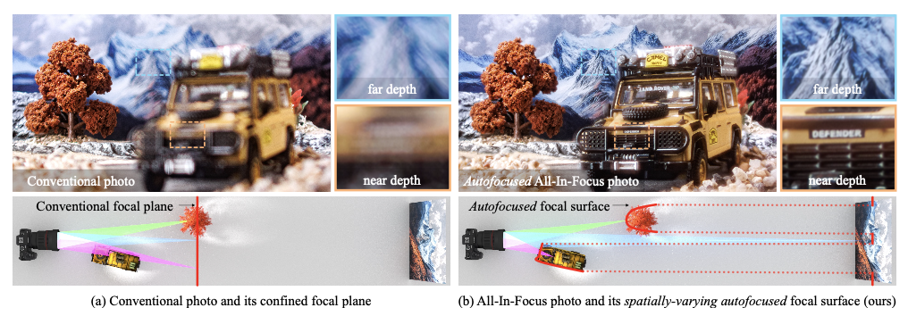 他们将经典自动对焦技术拓展至空间变化场景:利用对比度与视差线索迭代估算深度图,使相机能够根据场景深度动态调整景深分布。