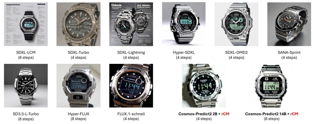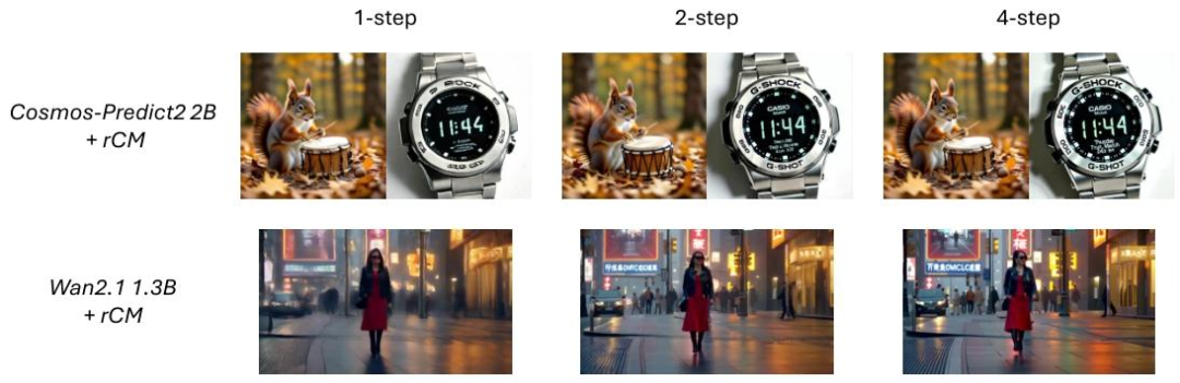 即便在1-2步的极限采样设置下,rCM依然能产出高质量、细节丰富的图像和视频。具体地,对于简单的图像提示词只需1步生成,复杂的图像和视频则需2-4步。
