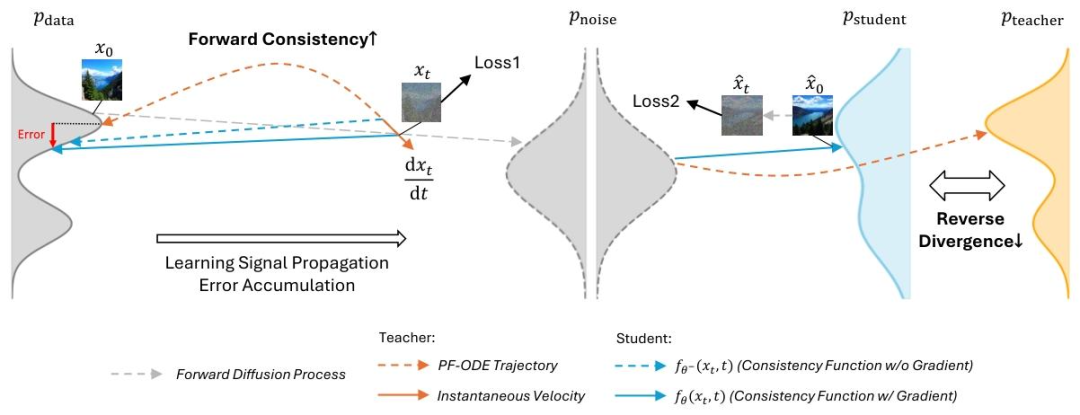 学生模型只在自己生成的样本上被监督,强制模型聚焦于高密度(高质量)数据区域,具有“模式寻求(mode-seeking)”的特性,从而显著提升生成结果的高质量。