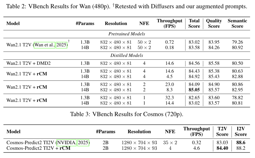 通过自研FlashAttention-2 JVP CUDA算子并兼容序列并行等分布式训练策略,首次成功将连续时间一致性蒸馏应用到Cosmos和Wan2.1等业界领先的大模型上。