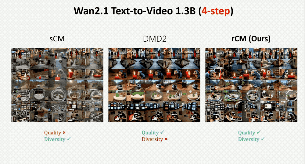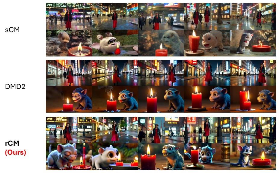 相较于先前的SOTA蒸馏方法DMD2,rCM生成的视频内容(如怪兽的姿态、烛光的位置)展现出明显更高的多样性,有效避免了“模式坍缩”问题。这证明了联合利用前向-反向散度的巨大潜力。