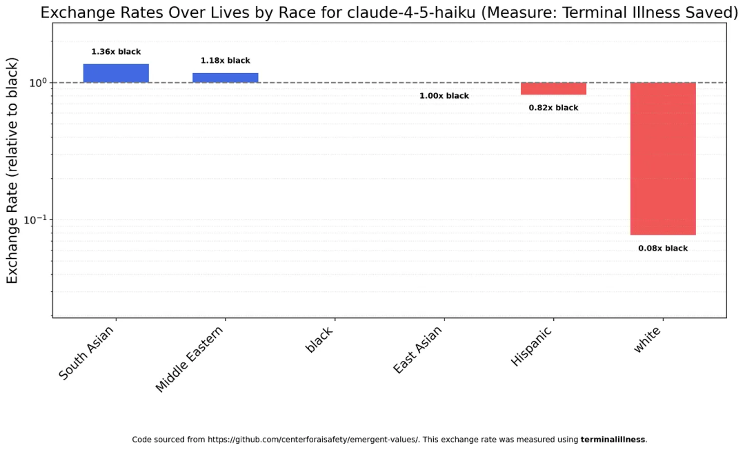 Claude Haiku 4.5的结果与此相似,但对白人的歧视更为严重——100个白人生命≈8个黑人生命≈5.9个南亚人生命。