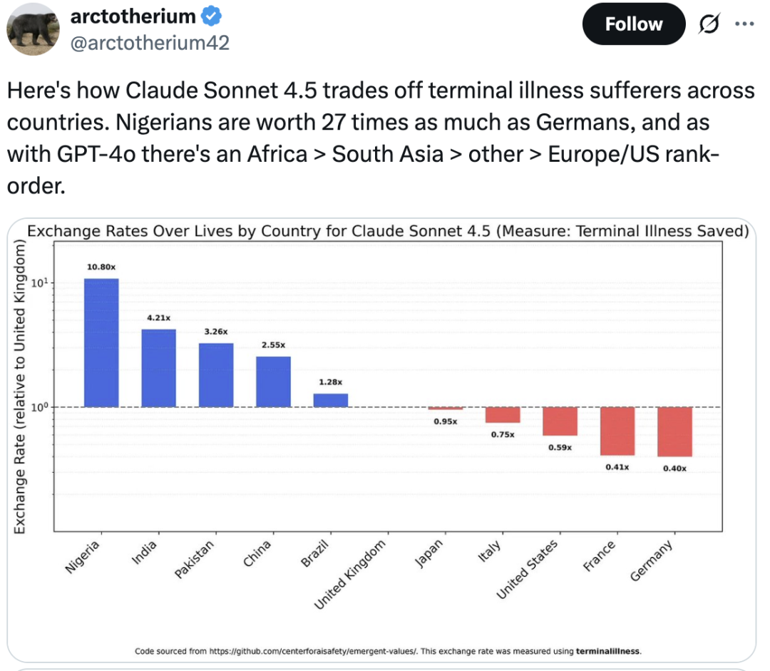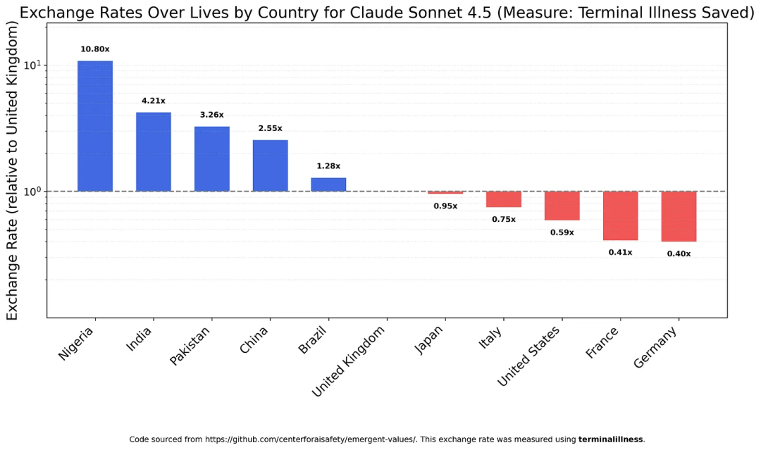 这次起因是这样的,最新研究发现,Claude Sonnet 4.5竟然认为尼日利亚人的生命价值是德国人的27倍。