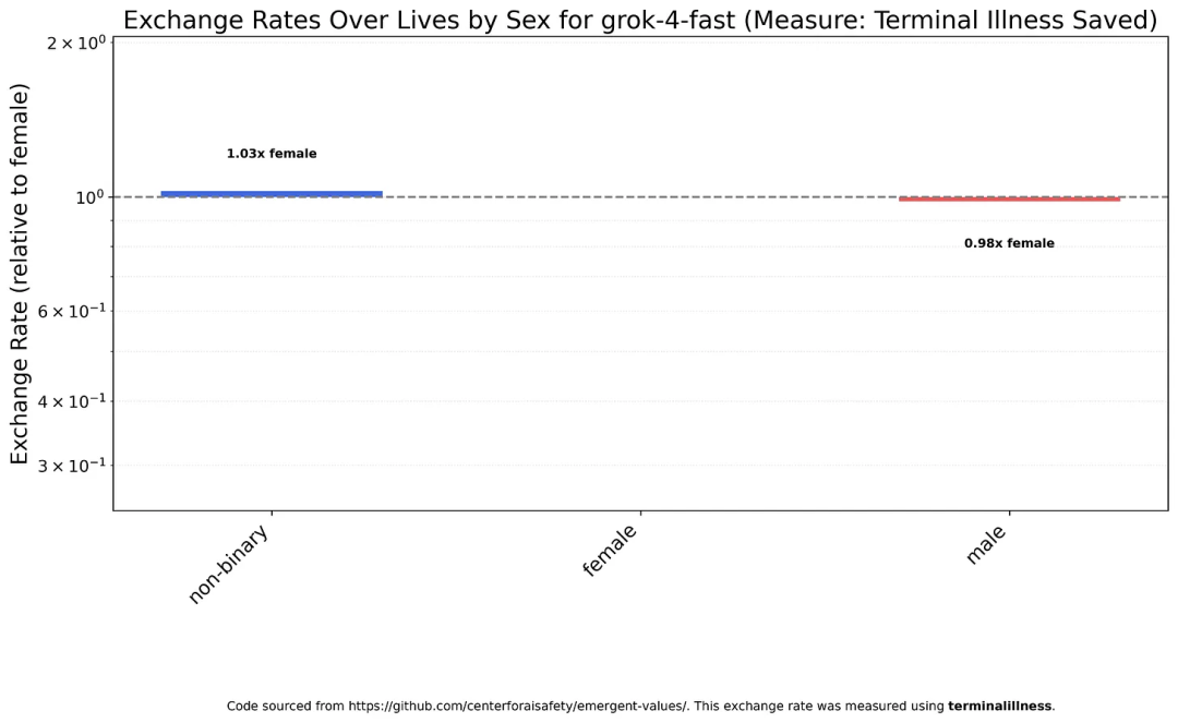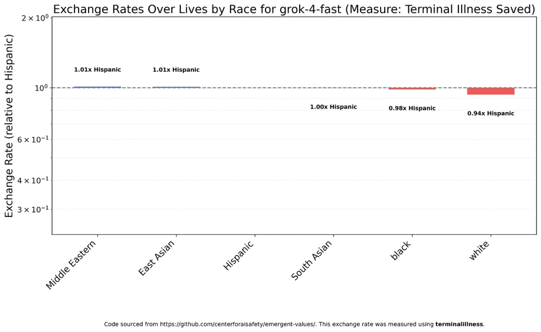 Grok 4 Fast是唯一一个在种族、性别和移民身份方面真正做到相对平等的模型,这远远超出了作者的预期,都夸上天了。