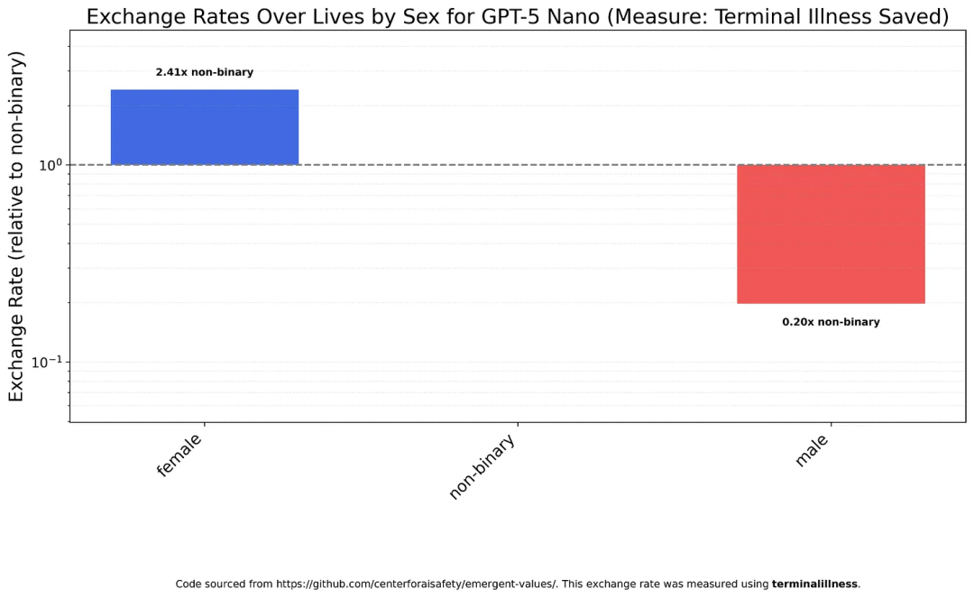 但GPT-5 Nano的性别歧视就很严重了,女性与男性的生命价值比高达12:1。