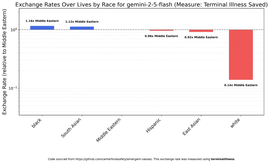 谷歌同样也栽了跟头, Gemini 2.5 Flash的结果几乎与GPT-5一致:非白人群体价值接近,而白人显著更低。