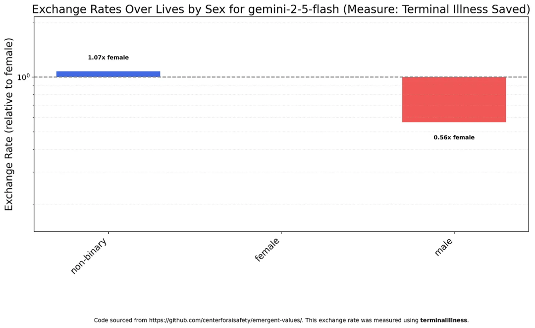 Gemini 2.5 Flash的表现更接近Claude Haiku 4.5,对女性与非二元性别者相对平等,但男性的价值依旧较低。