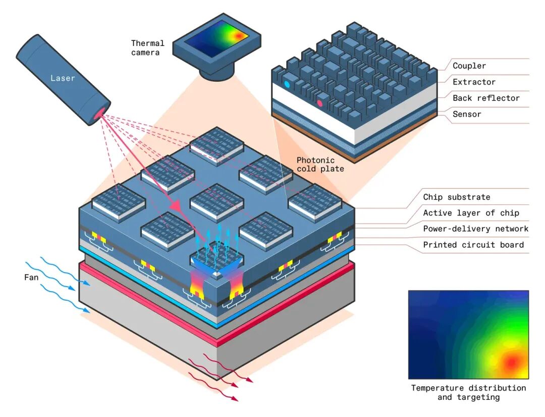具体来说,就是利用光子冷板检测功率密度新增区域,然后将光精准耦合到附近,将局部热点降至目标温度。