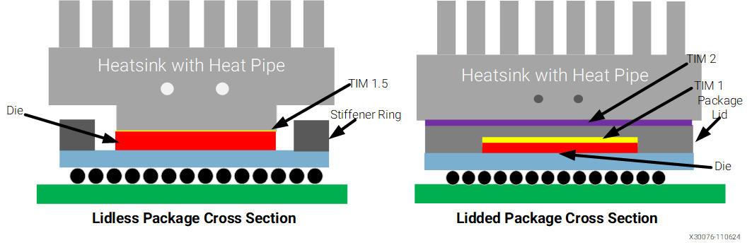 AMD也在同月专门针对嵌入式器件提出了新的散热设计方案,采用优化的TIM(热界面材料)改善热接触,并建议器件封装中尽量选择无金属封盖,可最大化减少内部TIM的热阻。