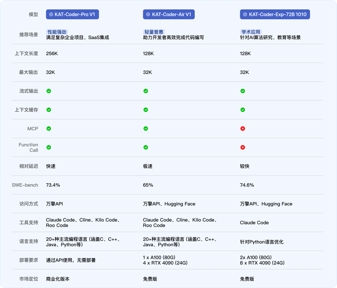 一套包含顶尖自研模型、智能开发工具和MaaS平台的“三位一体”产品矩阵,同时宣称其KAT-Coder-Air轻量版模型将对所有用户“免费使用”。