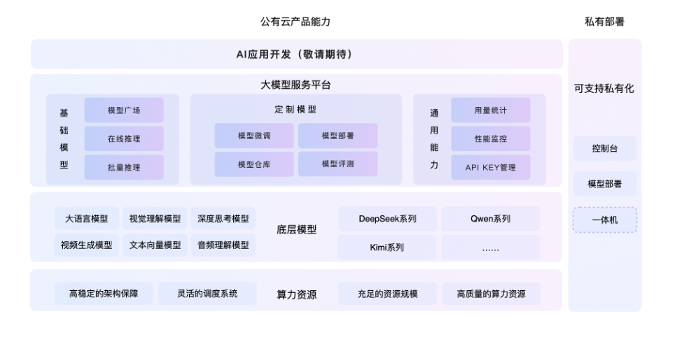 平台以高稳定的架构、高质量的算力资源为基础,通过自研模型和三方模型持续丰富底层模型生态,进而构建起一个高可用、安全易用的大模型服务与开发平台。通过兼容私有化部署,为企业级用户提供各种适应自身业务场景的调用方式。