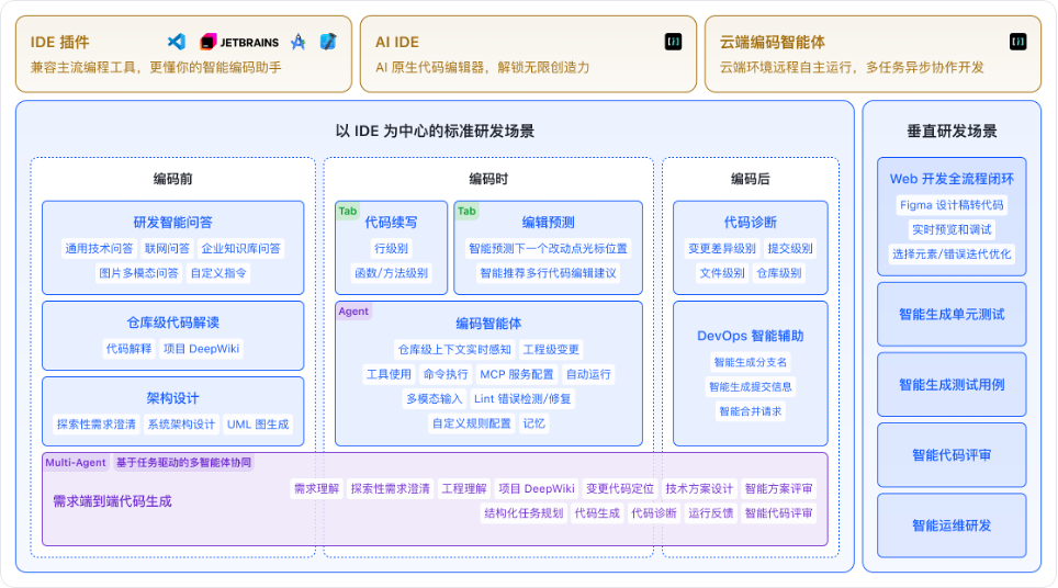 原生体验:革新开发协作模式。AI原生代码编辑器和云端编码智能体带来多任务异步开发、人机深度协作的新一代智能开发体验。