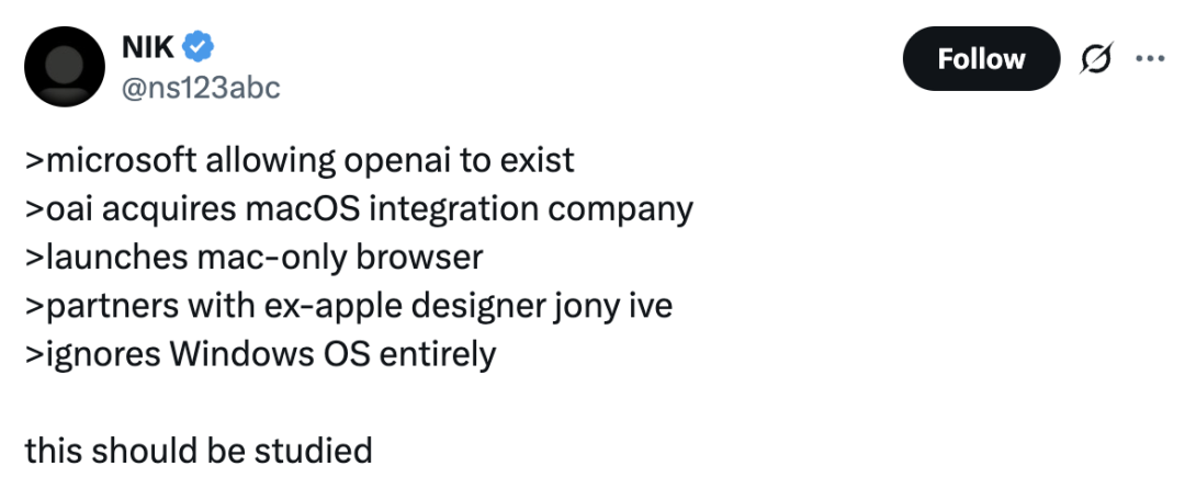 网友调侃,如今的OpenAI简直是彻底无视自家「老板」,打造专属Mac的浏览器还不够,现在连操作系统的主阵地都进出自如了。