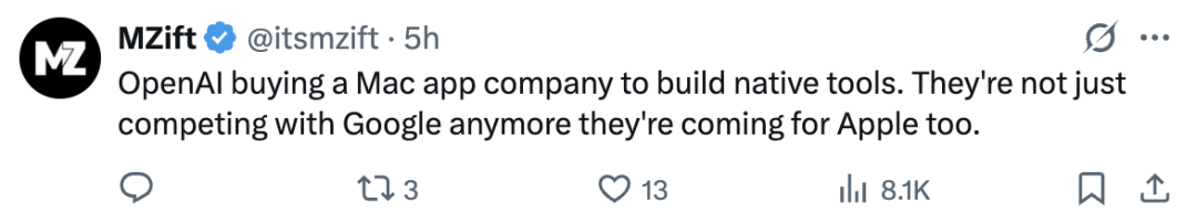 OpenAI收购了一家Mac应用公司,准备打造原生工具。他们现在不仅是在和Google竞争,连Apple也要一起卷进来了。