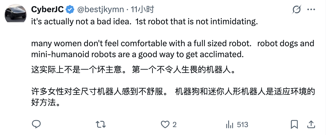 比如这个网友提到,像Bumi这样mini尺寸的机器人可能对女性更友好,不会那么令人生畏: