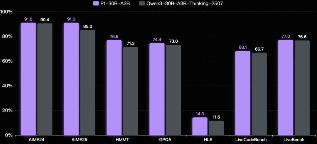 除了强大的物理推理能力,P1模型在多个领域的能力也得到进一步提升。如下图所示,P1-30B-A3B相比于基座模型Qwen3-30B-A3B-Thinking-2507,在数学、代码、STEM等基准测试上均取得显著优势,证明了物理推理能力的强大泛化性。