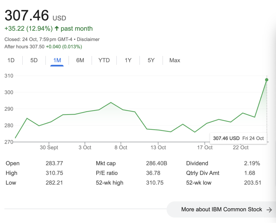 当然IBM自己也涨了209亿美元市值,来到2864亿美元。