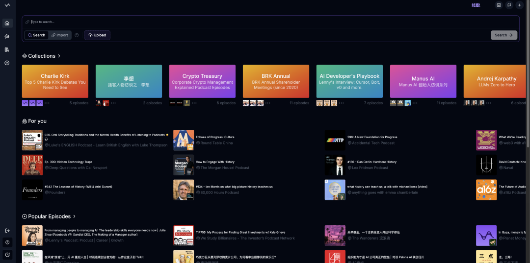 Podwise聚焦的是干播客,也就是有硬核内容、高信息量的播客,比如科技、AI、历史、健身、健康这些领域的节目。