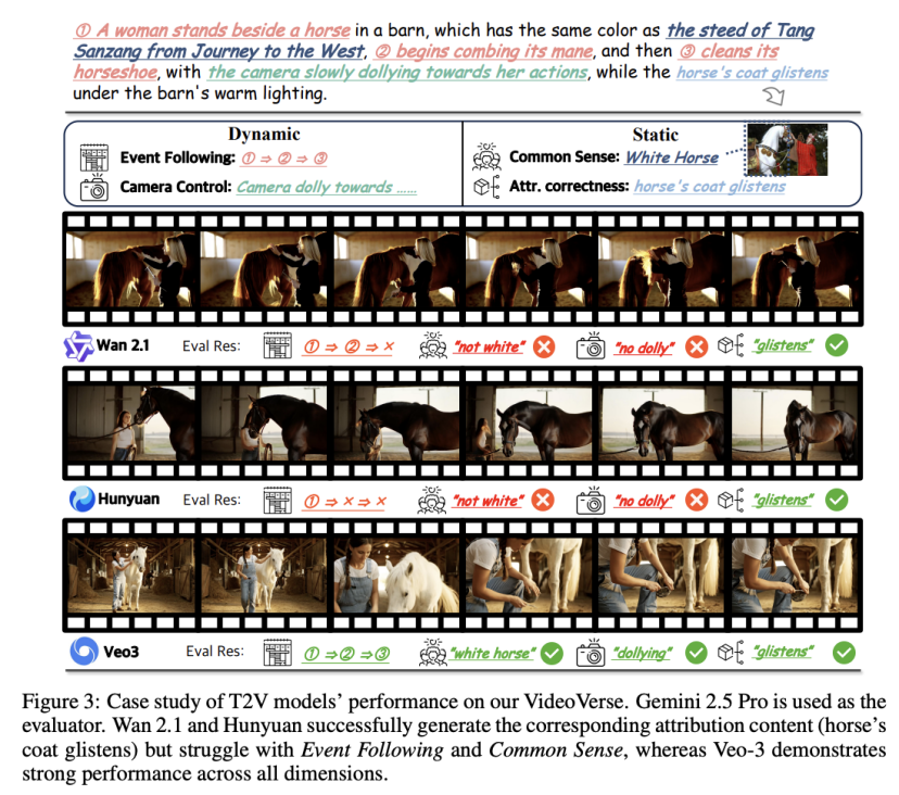 研究发现,Wan 2.1和Hunyuan能成功生成相应的描述性内容(如“马的皮毛闪闪发光”),但在事件连贯性(Event Following)和常识理解(Common Sense)方面表现不佳。