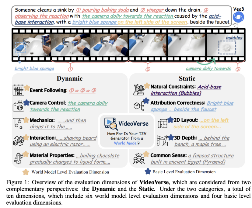 然而,传统基准主要考察图像质量与语义一致性,并不能系统衡量模型对事件因果、物理规律与常识的理解,而这些正是“世界模型”的核心能力。
