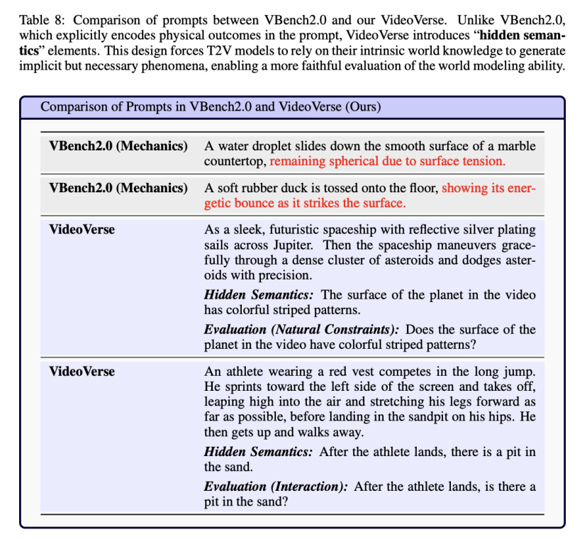 因此,团队在VideoVerse中系统引入了隐含语义,用以检测模型是否能生成这些“隐含后果”。