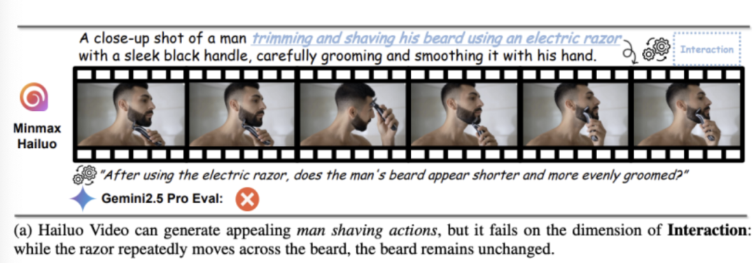 例如Hailuo Video能生成视觉上颇具吸引力的剃须动作,但胡须始终没有刮掉。
