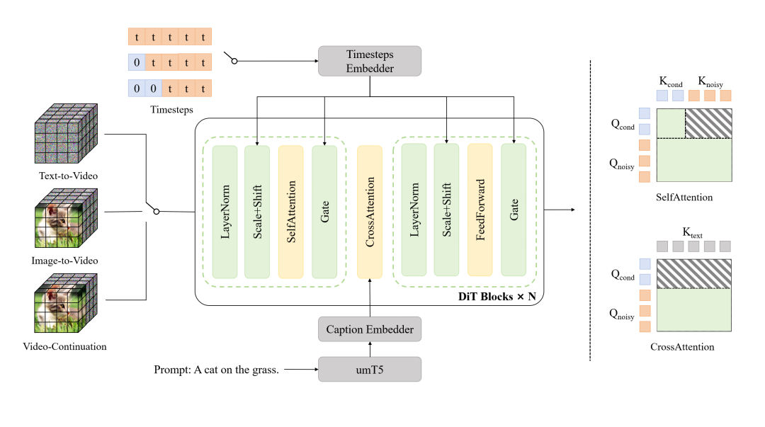 统一混合输入后,将无噪声的条件帧和待去噪的噪声帧沿着时间轴拼接,结合时序步配置,以实现单模型原生支持多任务。