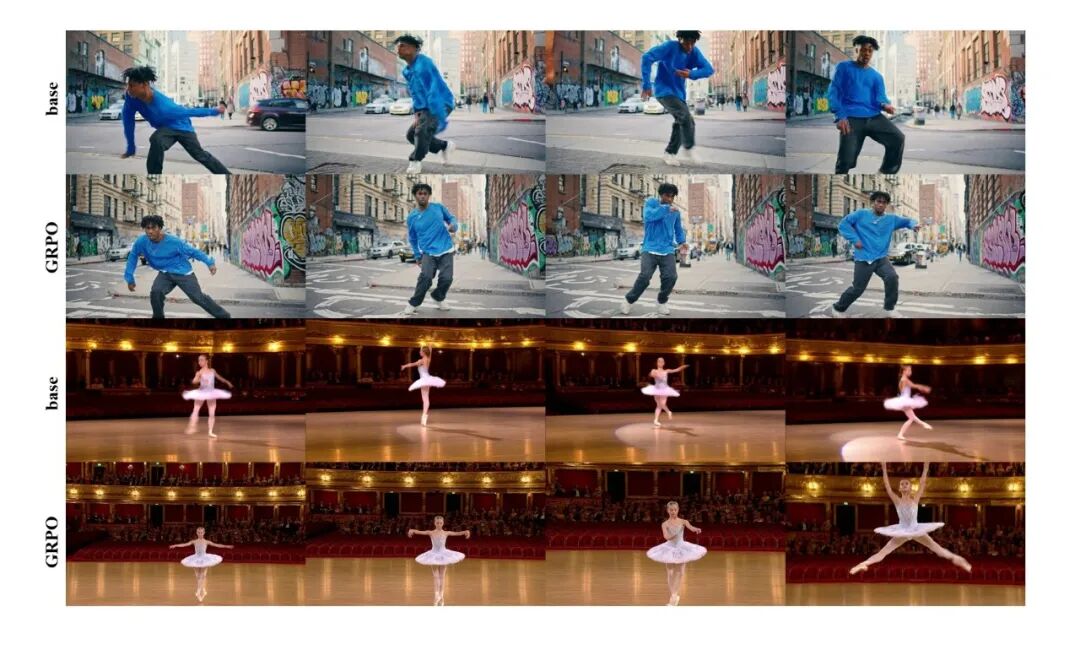 另外针对视频生成场景,使用组相对策略优化 (GRPO)算法,提升GRPO在视频生成任务中的收敛速度与生成质量。