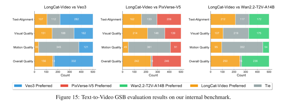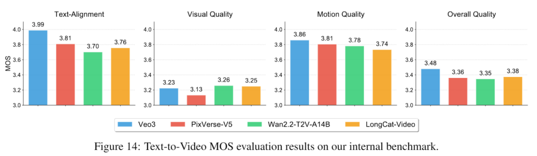 实验结果表明,LongCat-Video在整体质量得分中超越PixVerse-V5和Wan2.2-T2V-A14B,视觉质量接近Wan2.2-T2V-A14B,仅略逊于闭源模型Veo3。