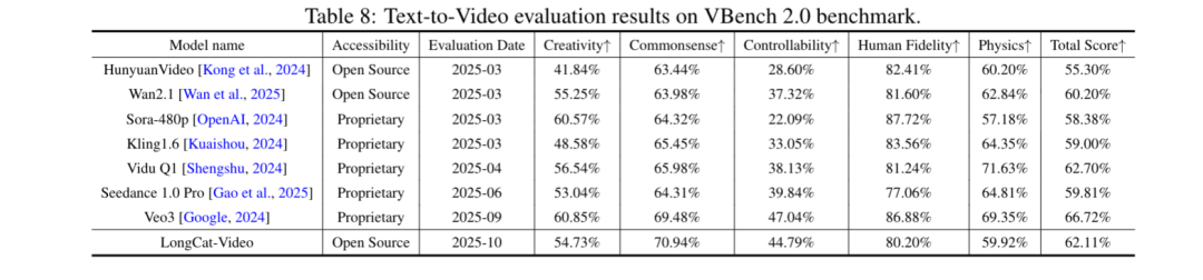 值得注意的是,LongCat-Video在常识性维度(运动合理性、物理定律遵循)上处于第一的领先优势,凸显出该模型优秀的物理世界建模能力。