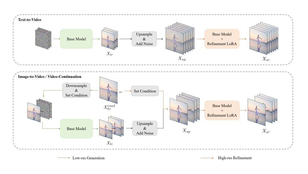 为了提高视频生成的推理效率,团队提出了一种从粗到精的生成范式,先是让模型生成480p、15fps的低分辨率低帧率视频,再通过三线性插值将分辨率升级至720p、30fps,同时由一个LoRA训练的精炼专家模型进行细节优化。