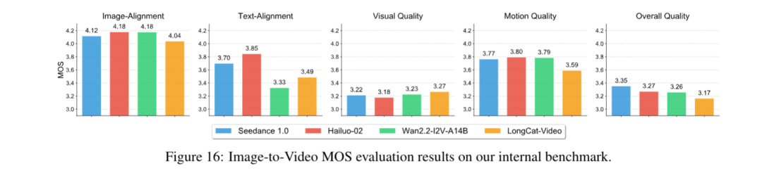 图生视频则在此基础上,新增图像对齐维度评估,最终结果中LongCat-Video的视觉质量得分最高(3.27),说明整体质量具有竞争力,但图像对齐与运动质量仍有提升空间。