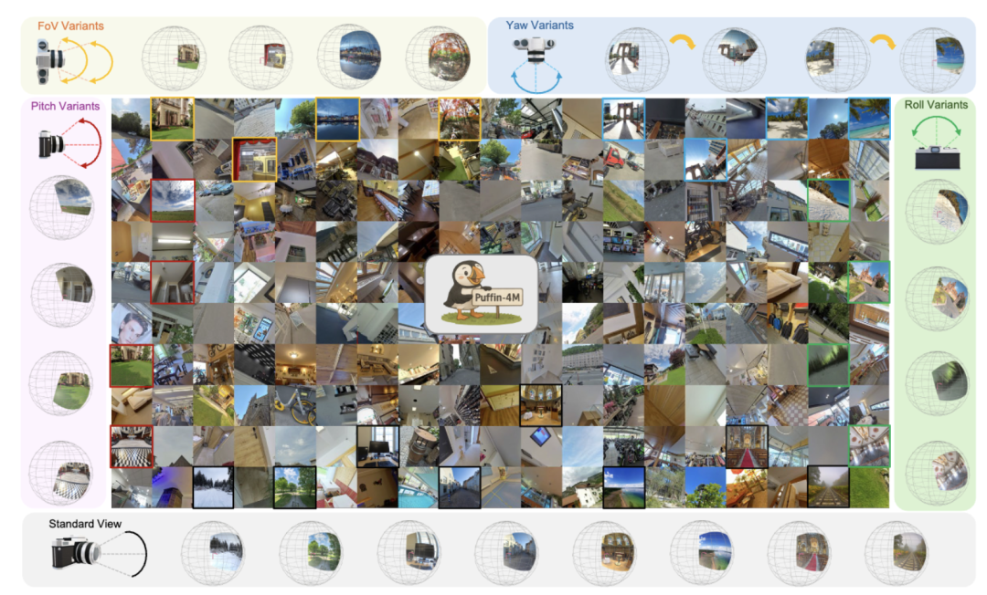 下图展示了Puffin-4M数据集的构建流程,其中包括四个阶段:360°全景数据的收集与预处理、2D透视图像的渲染生成、场景描述与空间推理打标,以及跨视角场景的扩展。